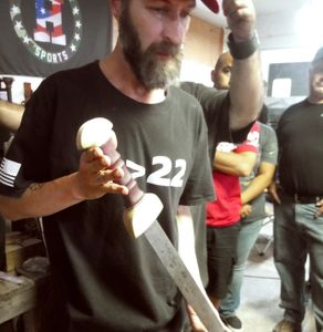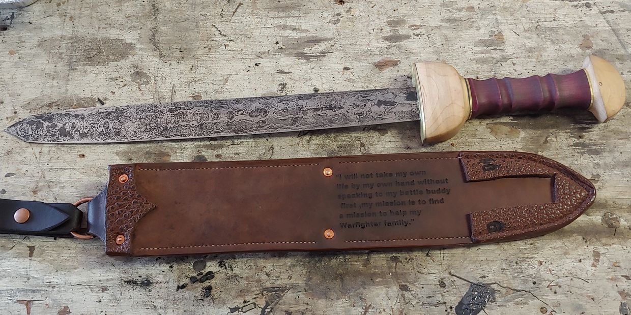 At the request of the Mr. Carney we left the blade with the fire scale look as it both shows the pattern and represents the fires it was from and later forged in. It was tough seeing the sword presented, this build means a lot to so many people and will be used for the Spartan Pledge against Veteran Suicide.