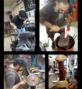 We had the good fortune of using our friend John Thunert's (JT Knifeworks) hydraulic forging press to set the welds on the canister damascus. Along with Chad Caylor's (Reforged) sons Victor & "Zeus", Tobin Nieto (Stonehaven Knifeworks) and I we all had a part in the initial and most crucial part of the build.